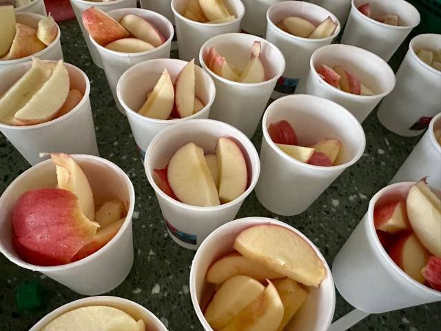 Die Äpfel finden reissenden Absatz und es ist eine Freude zu sehen, wie gerne die Schülerinnen und Schüler ein gesundes Znüni haben.