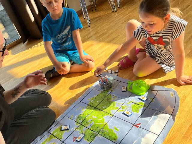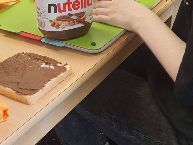 Modul 1: Die Kinder erlebten, wie ein Algorithmus funktioniert. In einem Spiel liefen sie durch ein Sortiernetzwerk und sortierten sich entsprechend ihrer Körpergrösse. In einer anderen Übung gaben die Kinder dem Erwachsenen, der sich wie ein Roboter verhielt, Anweisungen, wie man ein Nutella Brot schmiert.
