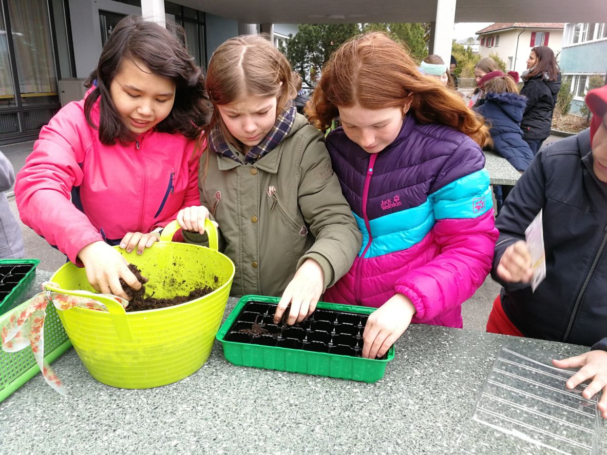 Am 14. März fiel der Startschuss: Die Schülerinnen und Schüler der 5b (heute 6b) lernten, wie man in Saatschalen sät. In kleinen Gruppen füllten sie Saatschalen, in der Hoffnung, dass daraus verschiedene Setzlinge entstehen würden: Zucchetti, Kürbis, Rande, Kopfsalat und Erdbeeren. In ihren Gruppen waren sie fürs Hegen und Pflegen der Saatschalen verantwortlich. Gleichzeitig fiel am 21. März dann auch im «Garten» der Startschuss. Es galt, 120m2 Rasenfläche umzugraben. Die Kinder beider Klassen arbeiteten hart und insgesamt ungefähr 7 Stunden, bis endlich anstelle von spröder Rasenfläche nur noch braune Erde zu sehen war.