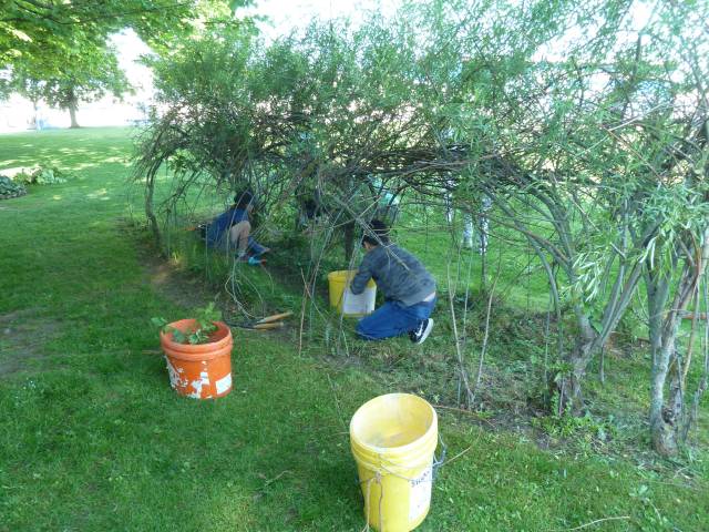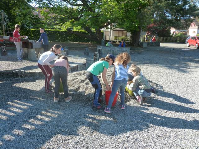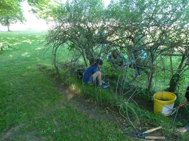 Mit Kesseln, Rechen und Besen bewaffnet, wurden die Holzschnitzel zurück an ihren ursprünglichen Platz gebracht, der Kies wurde aus dem Holzhäuschen gefegt und der Sand in den Sandkasten gewischt. Weiden- und Efeuhäuser wurden gepflegt und zurückgeschnitten und der Sand, die Arena und der Garten von Unkraut befreit.