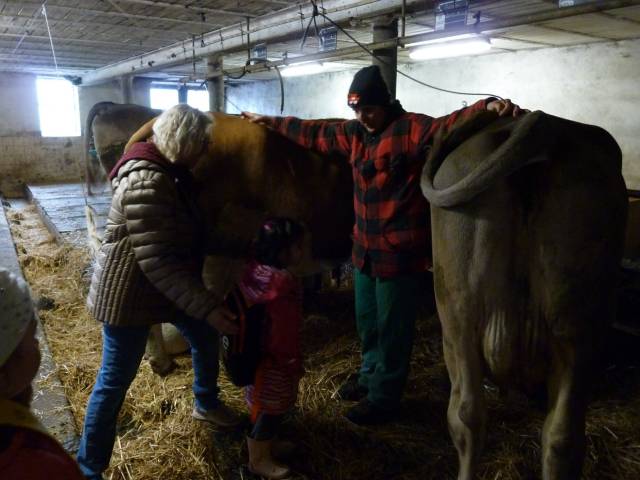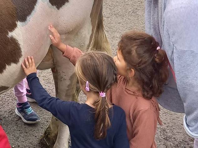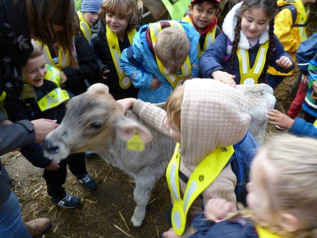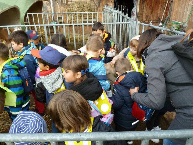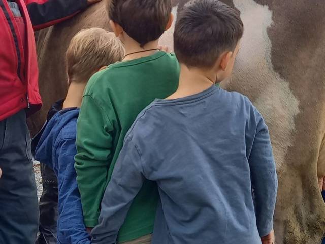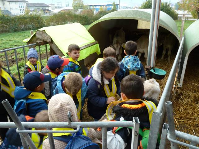 Am Morgen bekommt die Familie Wittwer auf ihrem Bauernhof Besuch von der Schule Bernstrasse und den Kindergärten Bernstrasse und Günzenen. Die Kinder sind aufgeregt und werden von Frau Wittwer in den Stall geführt. Dort gibt es die ausgewachsenen Kühe zu bestaunen, die gemütlich nebeneinander stehen und liegen. Unter der fachkundigen Begleitung von Frau Wittwer kann jedes Kind eine Kuh streicheln und hautnah erleben. Auch draussen halten sich die friedlichen Tiere gerne in ihrem Laufstall auf und die Kälbchen beschnuppern neugierig die Hände ihrer kleinen Besucher.