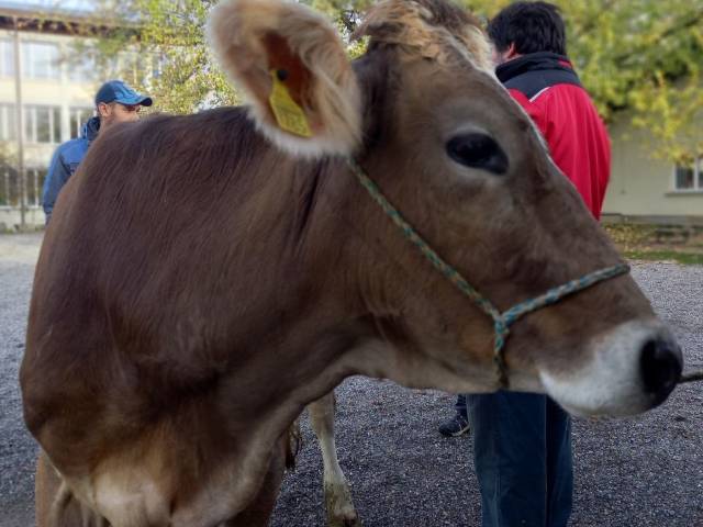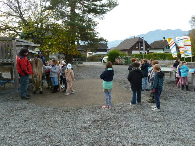 Währenddessen führt Herr Wittwer seine Kuhdame "Atlanta" am Strick zum Schulhaus Sonnenfeld. In der grossen Pause dürfen die Kinder aus der Primarschule und den zugehörigen Kindergärten das grosse, sanfte Tier von allen Seiten betrachten und streicheln.