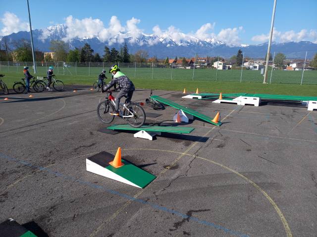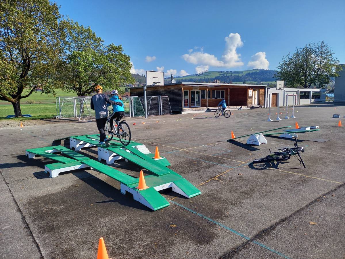 Es handelt sich dabei um einen spielerischen Geschicklichkeitsparcours für junge Velofahrerinnen und Velofahrer im geschützten Raum. Die Lernenden fuhren gewagt über Wippen und Podeste.